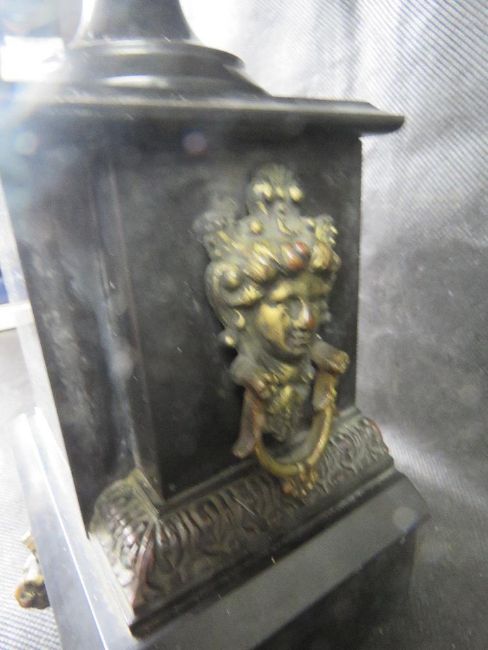 A large and impressive Victorian slate tazza of column form having brass lion head to each side.
