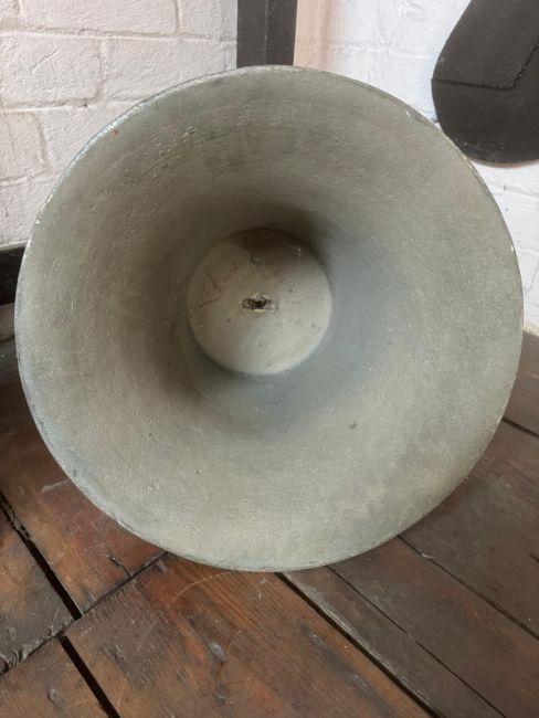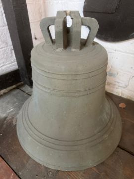 A cast bell with cast in crown staples removed, top drilled, clapper deficient, floral relief shield with initials JB. Cast in bell-metal. Standing 41cm high, 43cm dia at mouth. Weight 50.6kg