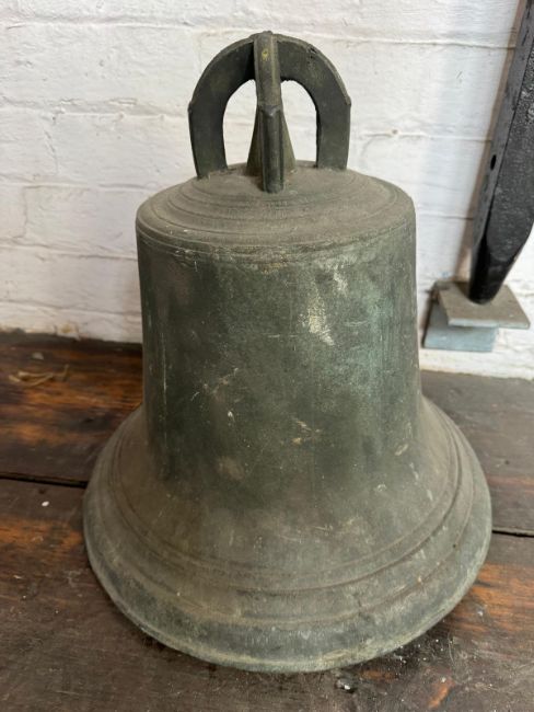 A cast metal bell having writing to crown of bell. Having cast iron ornate clapper and hanger. Cast in bell metal. Cast in crown staples. Height 43cm, 40cm dia at mouth. Weight 31kg.