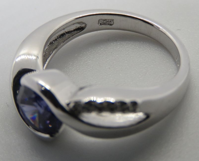 A silver blue stone ring, stamped 925, size K.