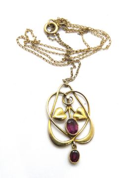 A 9ct gold Art Nouveau pendant set with two oval cut garnets, on chain, pendant approx 3.1cm in length, total weight 2.2g.