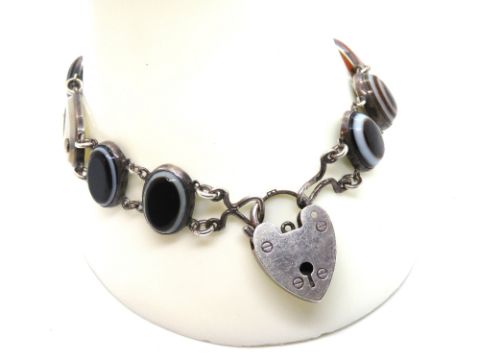 A finely made Scottish hardstone bracelet, each carved panel set in white metal, no apparent hallmark, with heart padlock clasp.