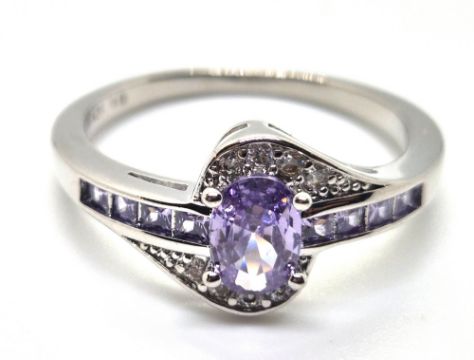 A silver ring set with purple and white stones, size T-U, stamped 925.